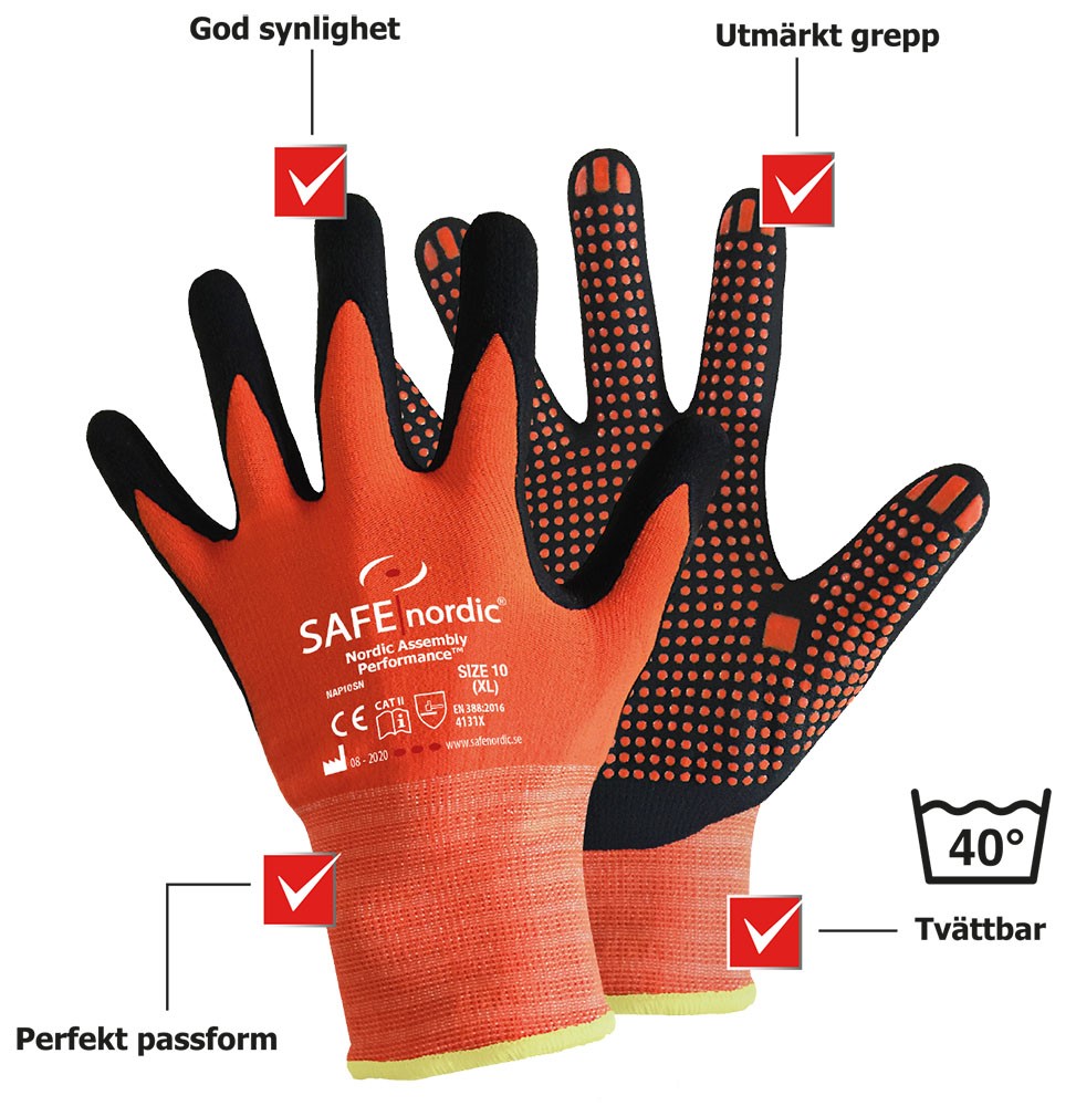 Nordic Assembly Performance™ har utvecklats för att ge ett perfekt grepp. Handskens insida är försedd med ”dots” som förutom förbättrat grepp också har en dämpande effekt. Genom handskens orange färg har den god synlighet. Nordic Assembly Performance kan tvättas i 40 grader.